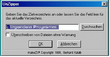 es sei denn, Sie besitzen Windows XP: hier ist nämlich in den Windows Explorer bereits ein Packer/Entpacker integriert, so daß Sie auf eine solche „Zip-Datei“ nur doppelt klicken müssen, um ihren Inhalt zu Gesicht zu bekommen.